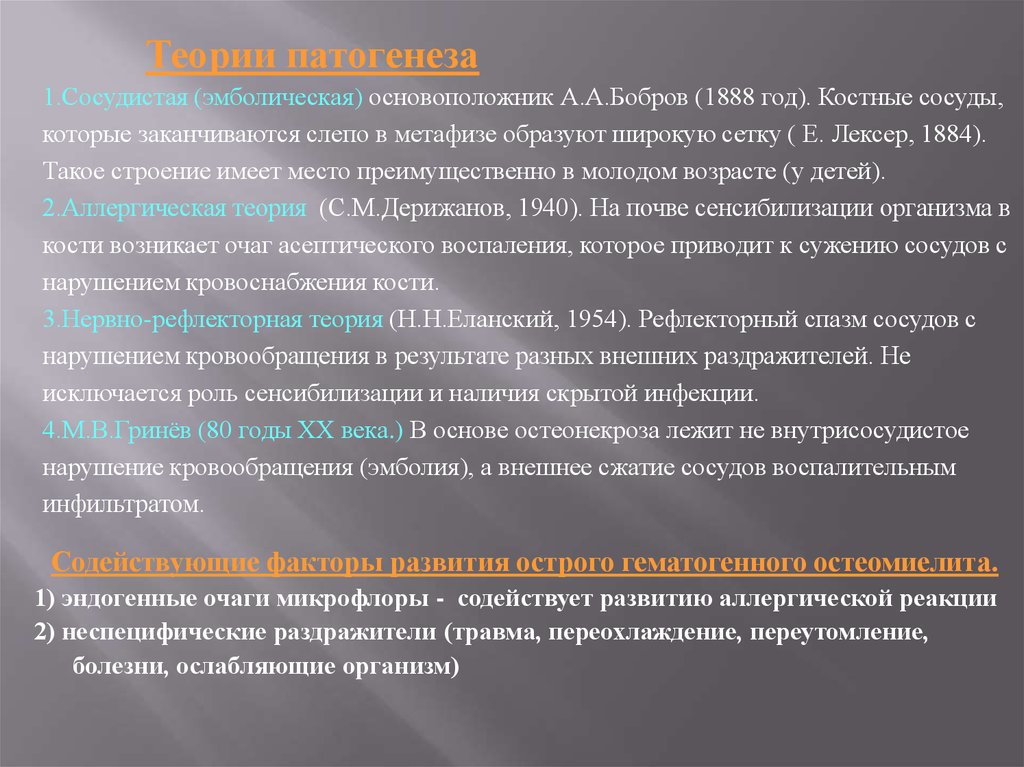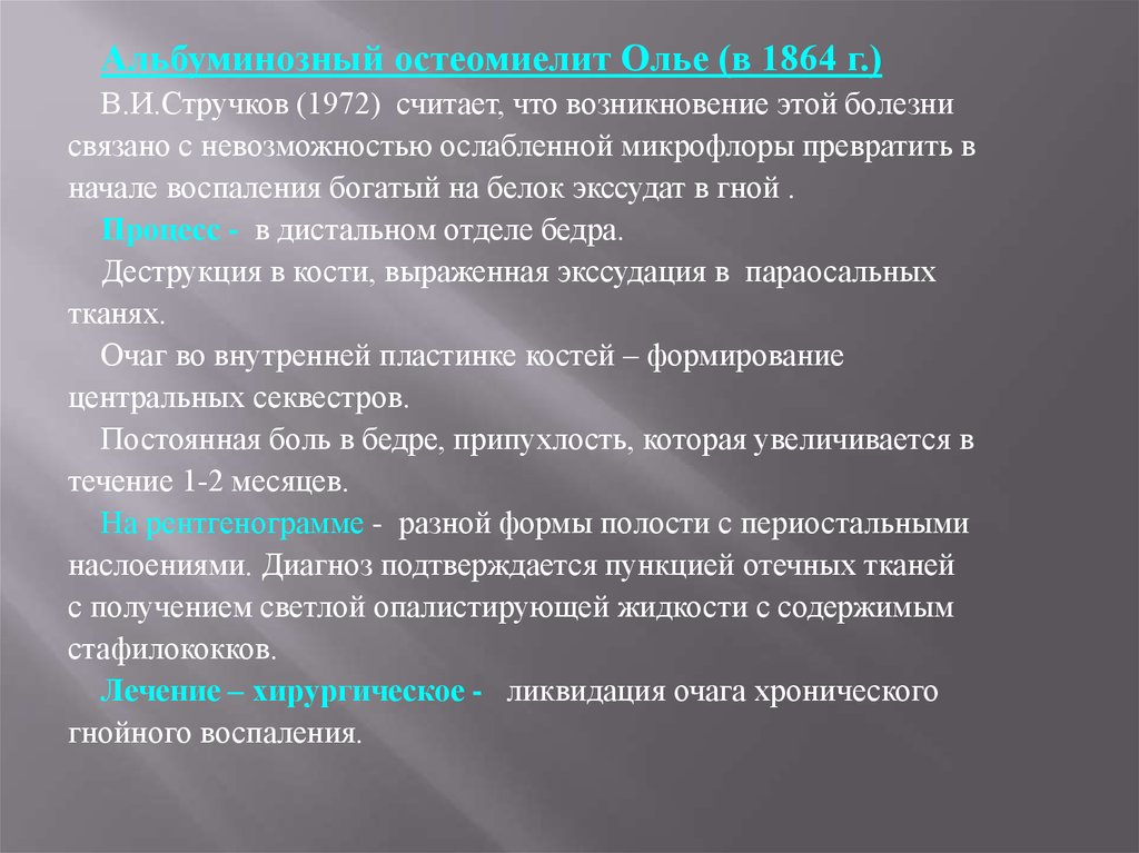 Альбуминозный остеомиелит Олье (в 1864 г.)В.И.Стручков (1972) считает, что возникновение этой болезни