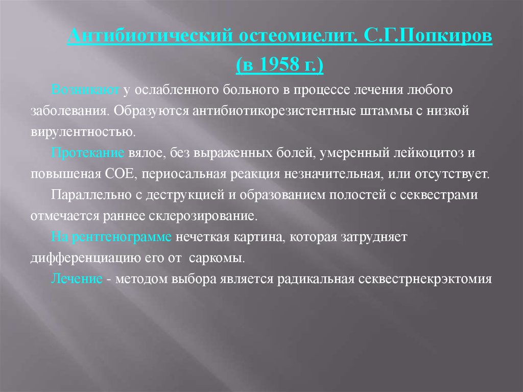 Антибиотический остеомиелит. С.Г.Попкиров(в 1958 г.)