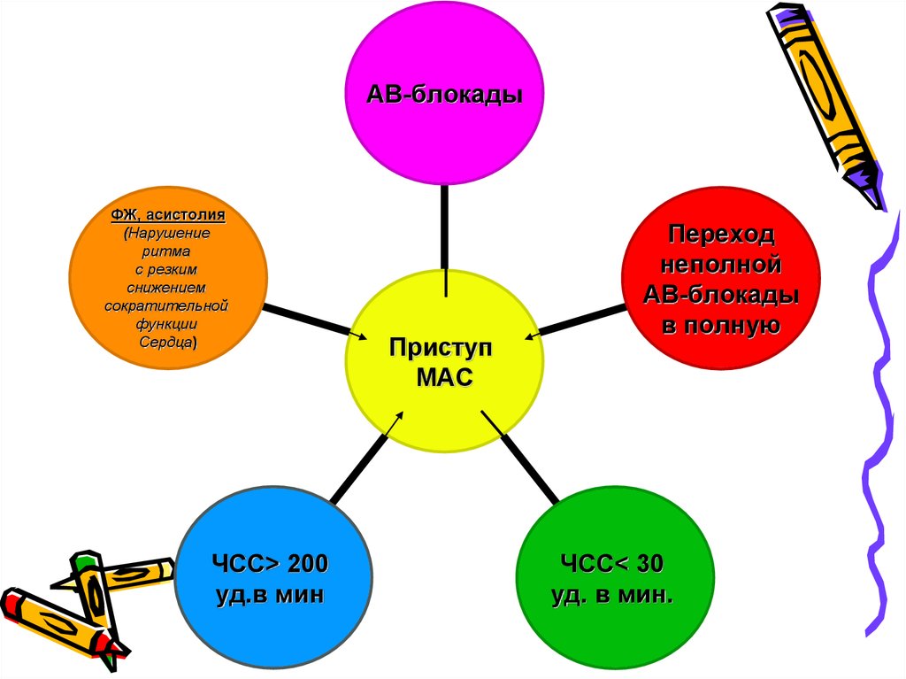 • синдром МАС может возникнуть и при полной АВблокаде в случае резкого урежения импульсов израсположенного в желудочке сердца гетеротропного