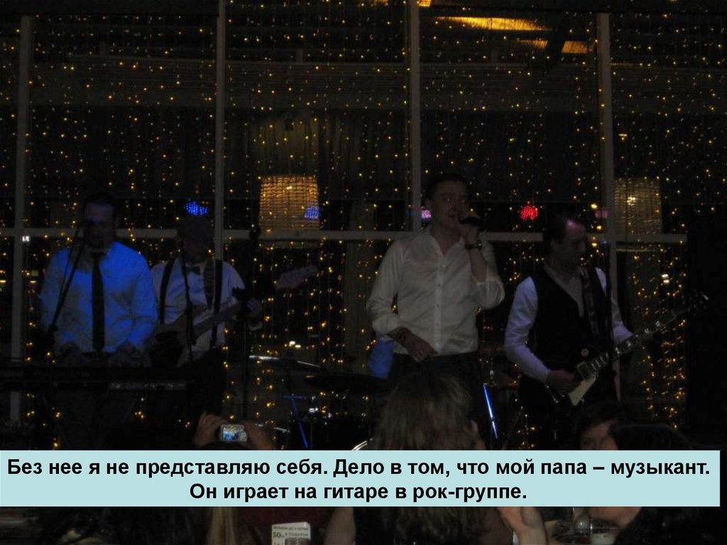 Без нее я не представляю себя. Дело в том, что мой папа – музыкант.Он играет на гитаре в рок-группе.