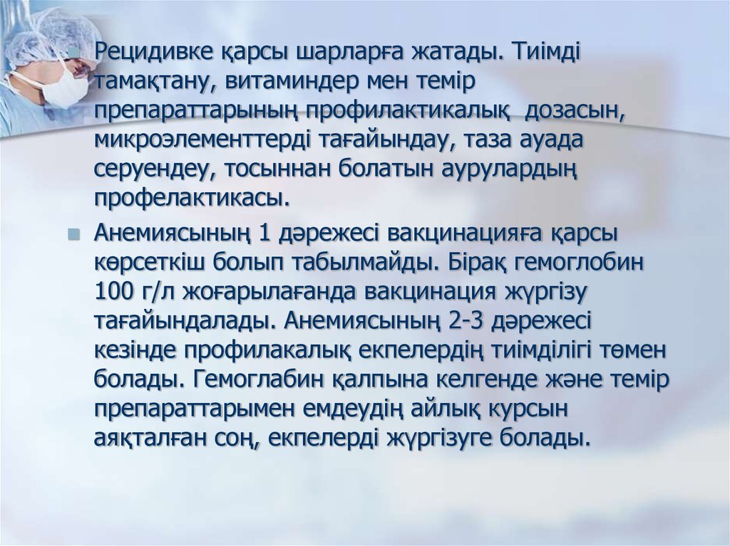 Рецидивке қарсы шарларға жатады. Тиімдітамақтану, витаминдер мен темір
