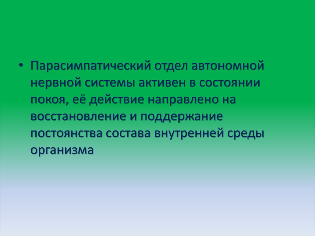 • Парасимпатический отдел автономнойнервной системы активен в состоянии