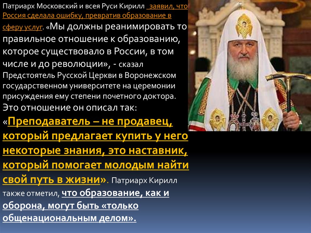 Патриарх Московский и всея Руси Кирилл заявил, чтоРоссия сделала ошибку, превратив образование в