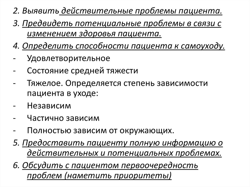 2. Выявить действительные проблемы пациента.3. Предвидеть потенциальные проблемы в связи с