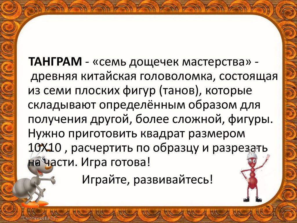 ТАНГРАМ - «семь дощечек мастерства» древняя китайская головоломка, состоящаяиз семи плоских фигур (танов), которые