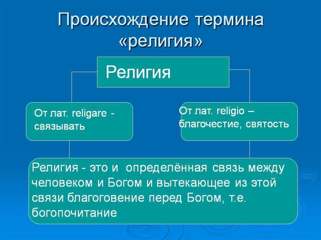 РЕЛИГИЯ:(от лат. religio — благочестие, набожность, святыня, предмет культа)мировоззрение и мироощущение, а также соответствующее поведение и действия