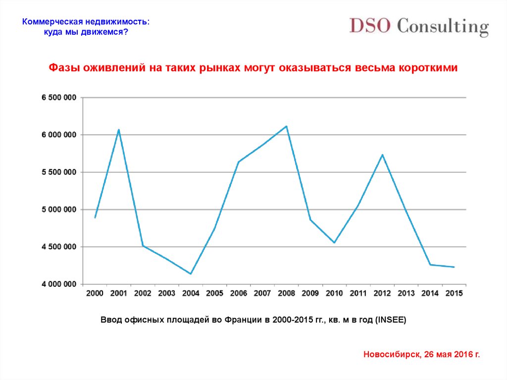 Ввод офисных площадей во Франции в 2000-2015 гг., кв. м в год (INSEE)