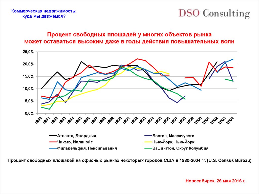 Процент свободных площадей на офисных рынках некоторых городов США в 1980-2004 гг. (U.S. Census Bureau)
