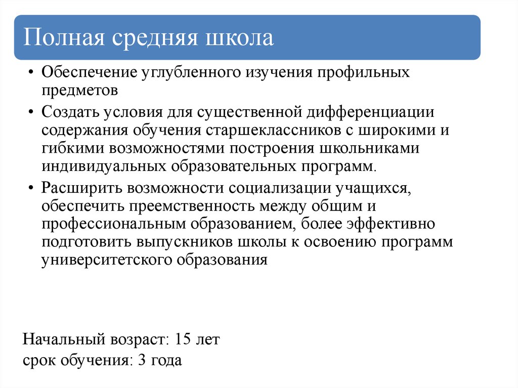 Полная средняя школа• Обеспечение углубленного изучения профильных