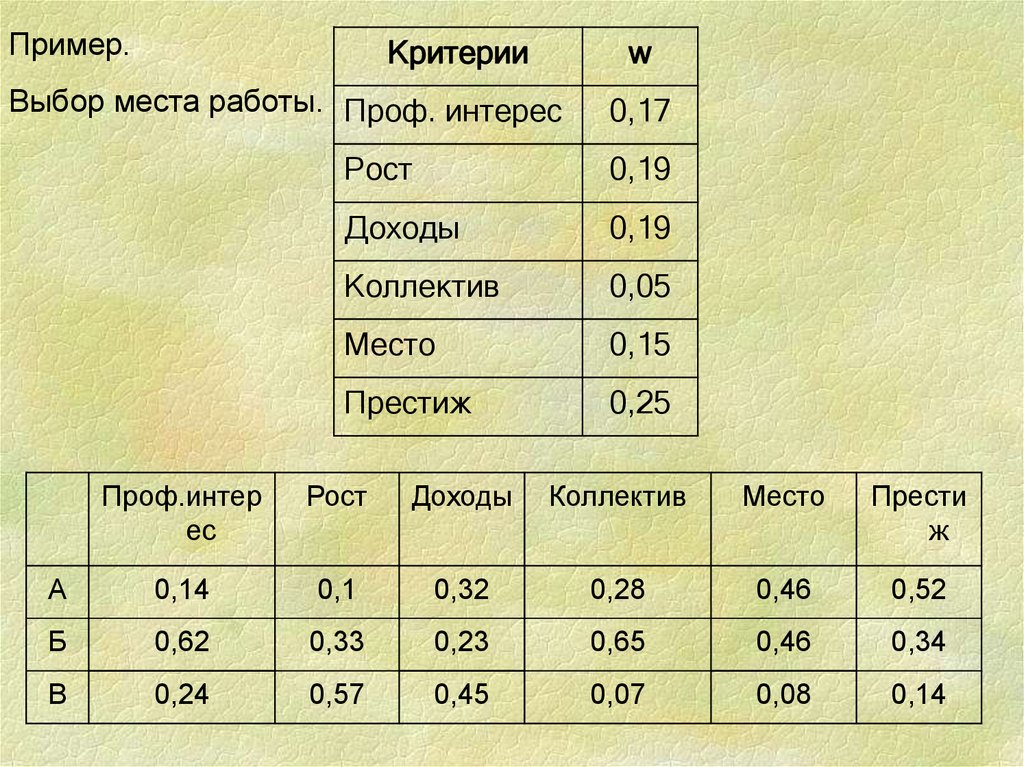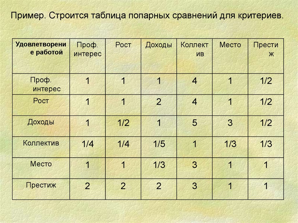 Пример. Строится таблица попарных сравнений для критериев.Удовлетворени