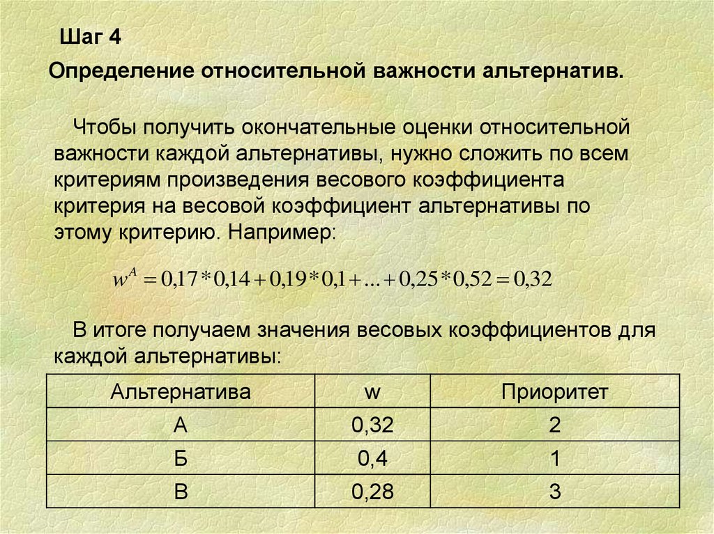 Чтобы получить оценки относительной важностикаждого элемента выполняют следующие действия:
