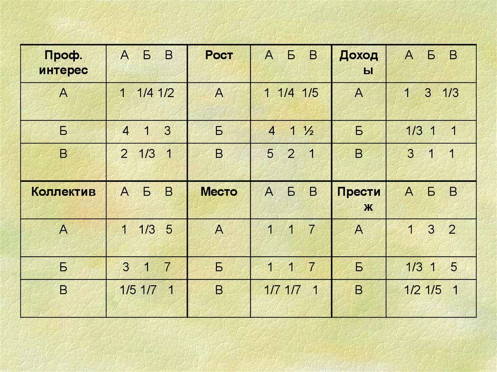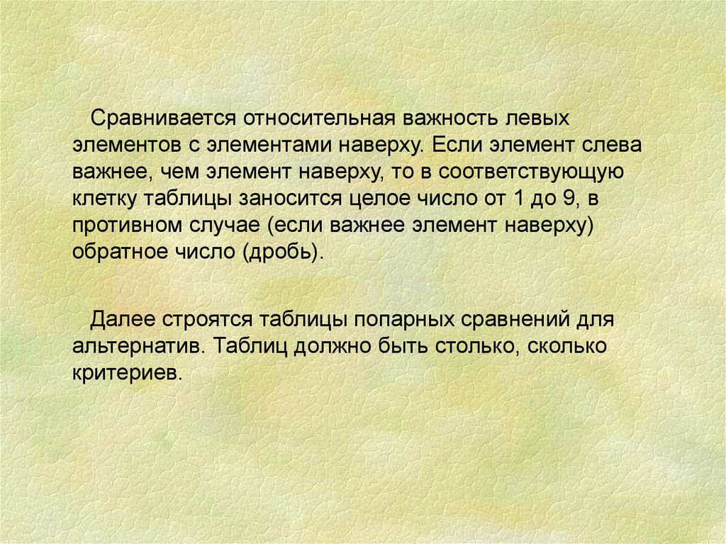 Сравнивается относительная важность левыхэлементов с элементами наверху. Если элемент слева