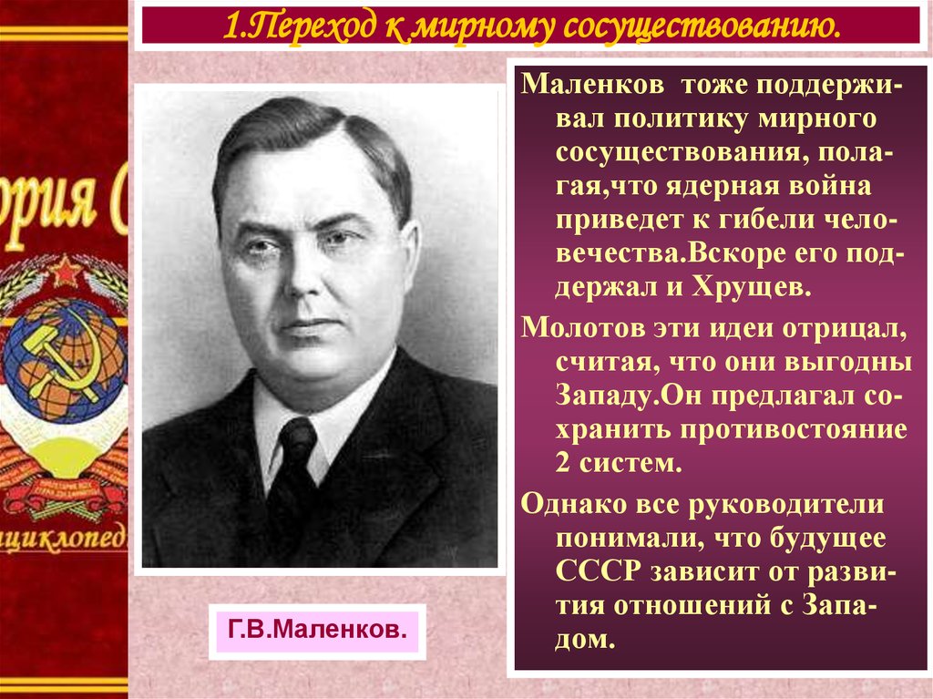 1.Переход к мирному сосуществованию.Г.В.Маленков.