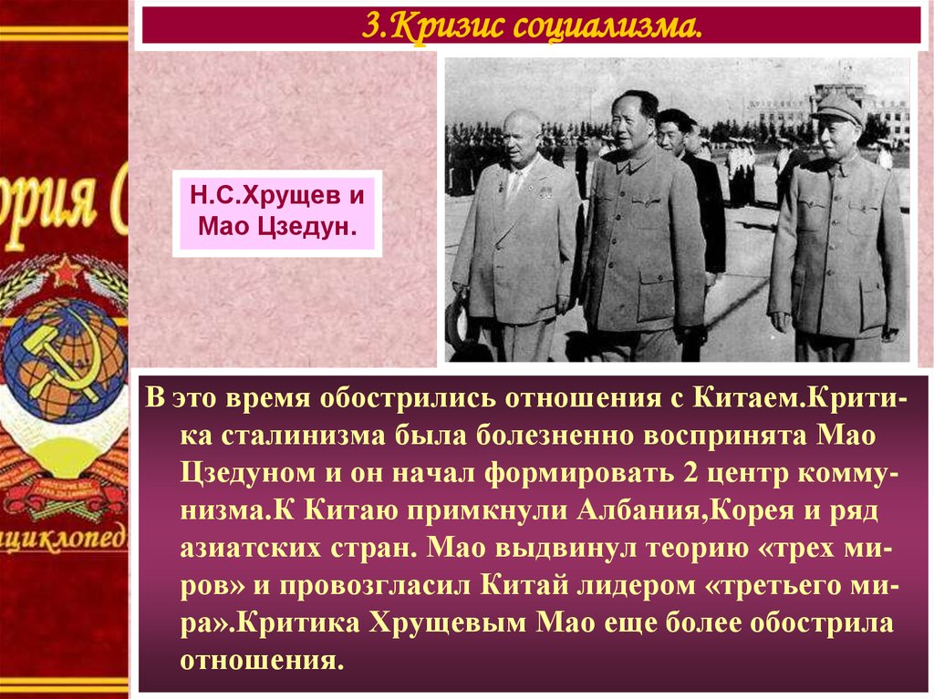 азиатских стран. Мао выдвинул теорию «трех миров» и провозгласил Китай лидером «третьего мира».Критика Хрущевым Мао еще более обострила