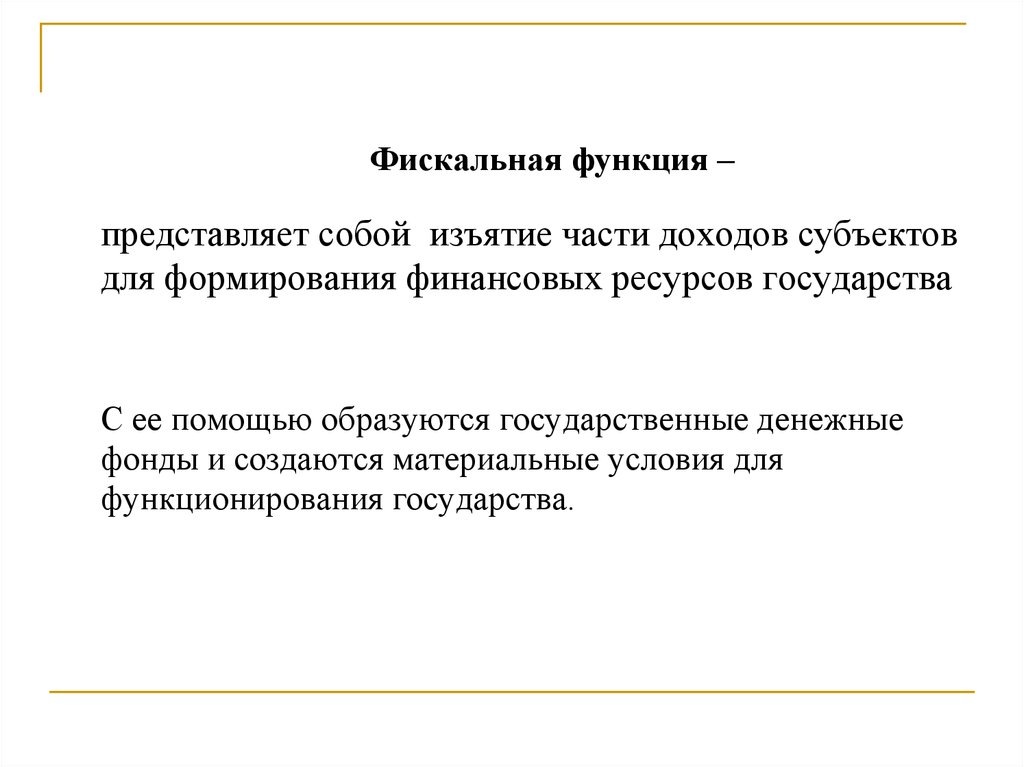 Фискальная функция –представляет собой изъятие части доходов субъектов