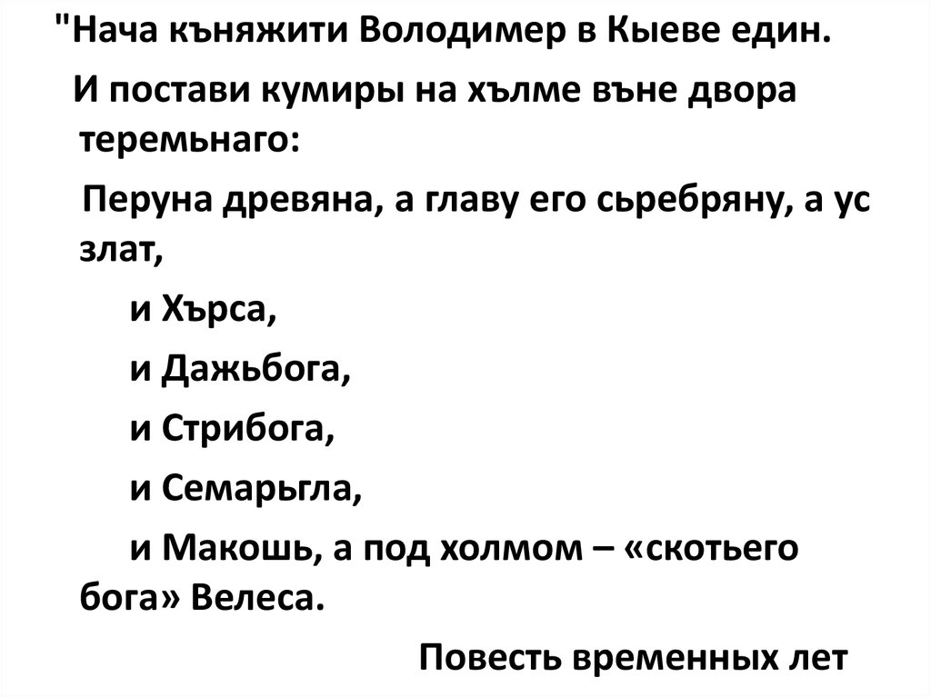 "Нача къняжити Володимер в Кыеве един.И постави кумиры на хълме въне двора