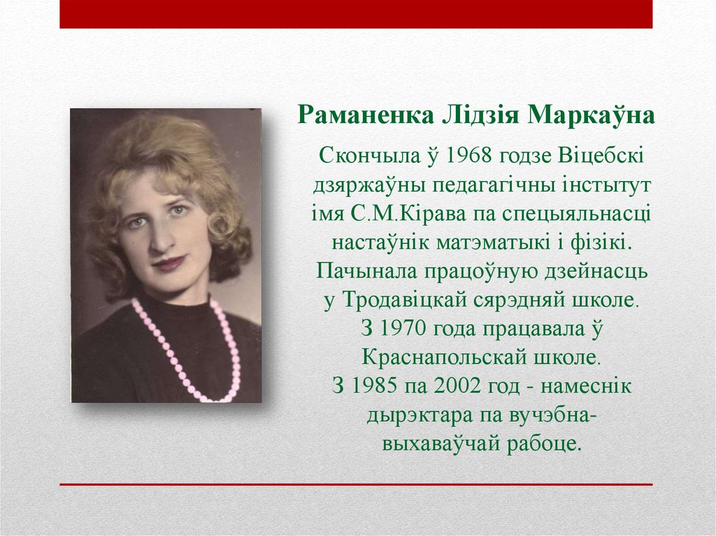 Раманенка Лідзія МаркаўнаСкончыла ў 1968 годзе Віцебскі