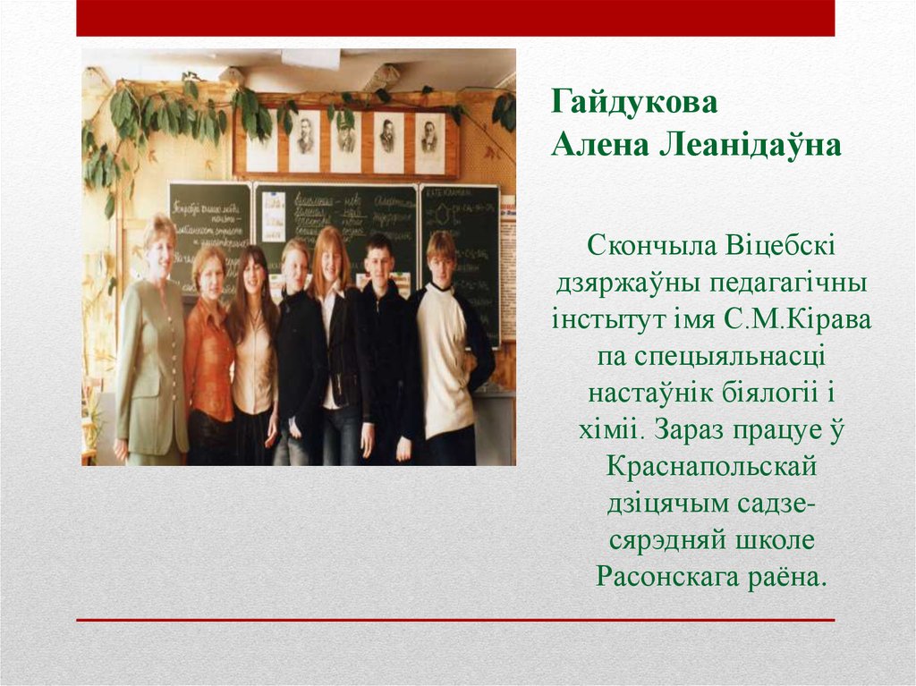 Раманенка Лідзія Маркаўна, настаўнік-ветэранГайдукова Алена Леанідаўна, настаўнік дзяржаўнай установы