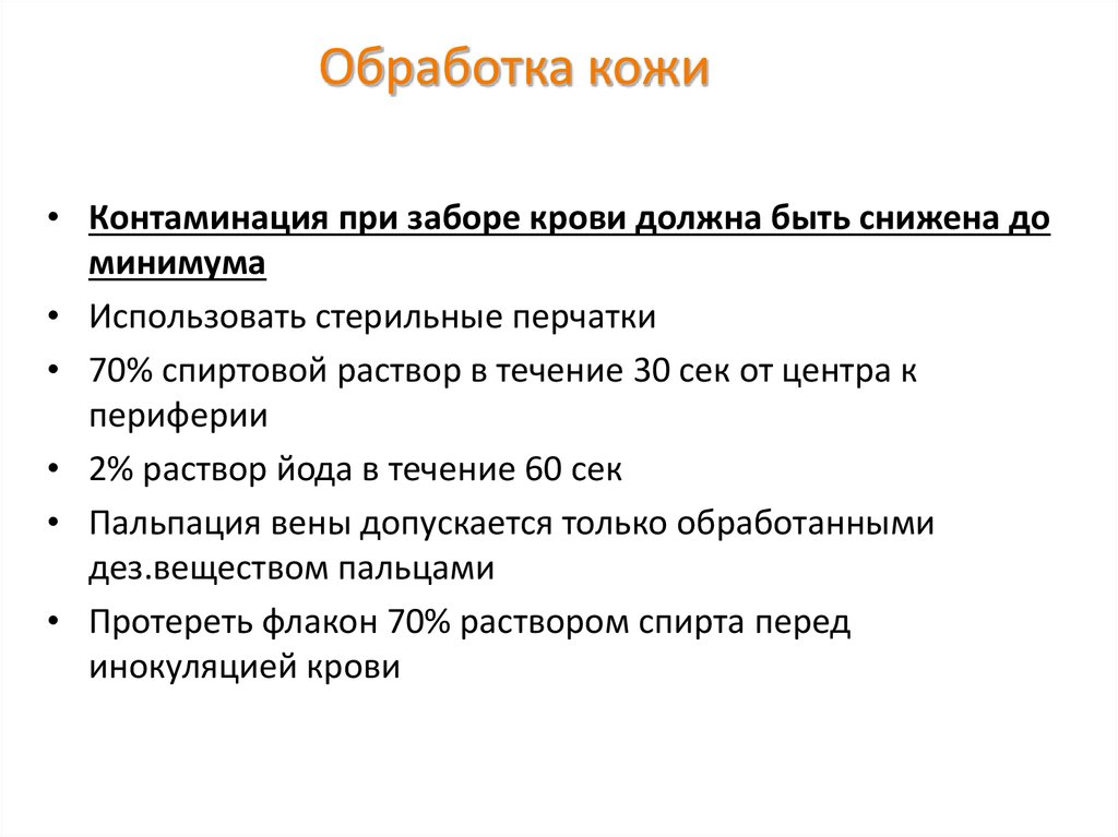 Обработка кожи• Контаминация при заборе крови должна быть снижена до