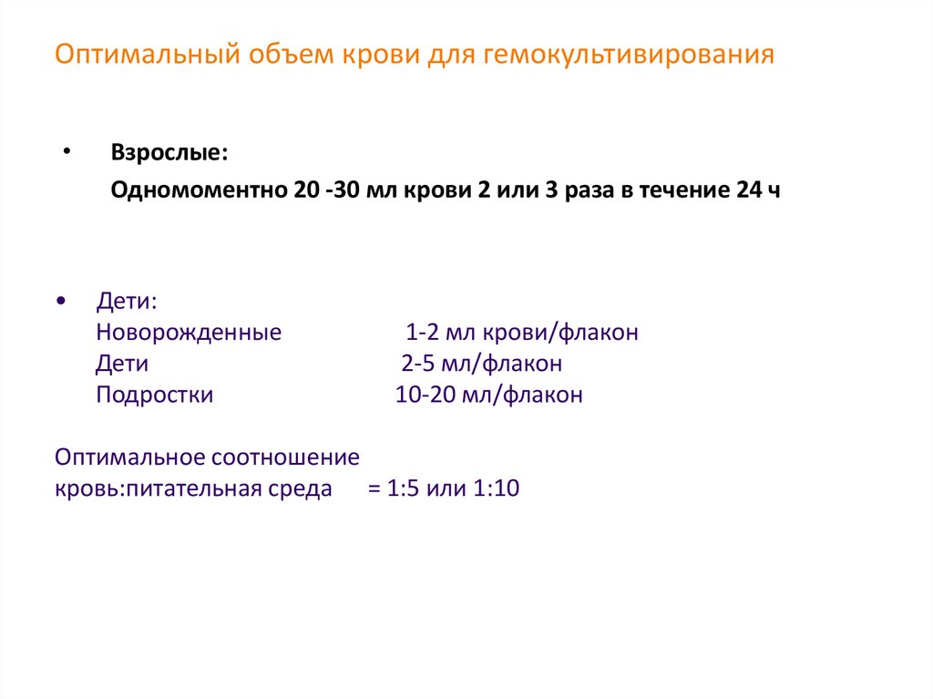 Оптимальный объем крови для гемокультивированияВзрослые: