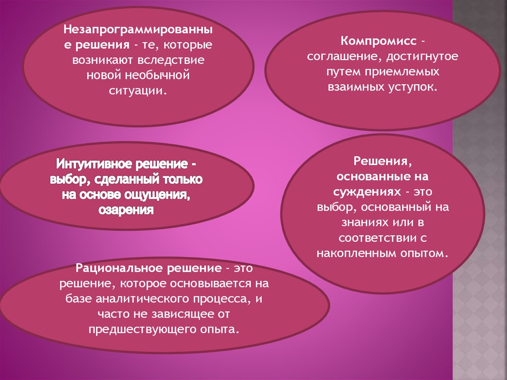 Решение - это выбор наиболее приемлемойальтернативы из возможного многообразия вариантов.