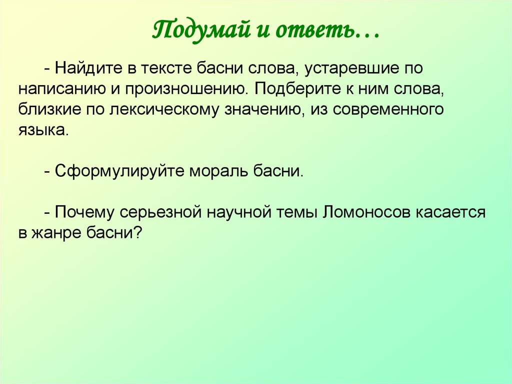 Подумай и ответь…- Найдите в тексте басни слова, устаревшие по