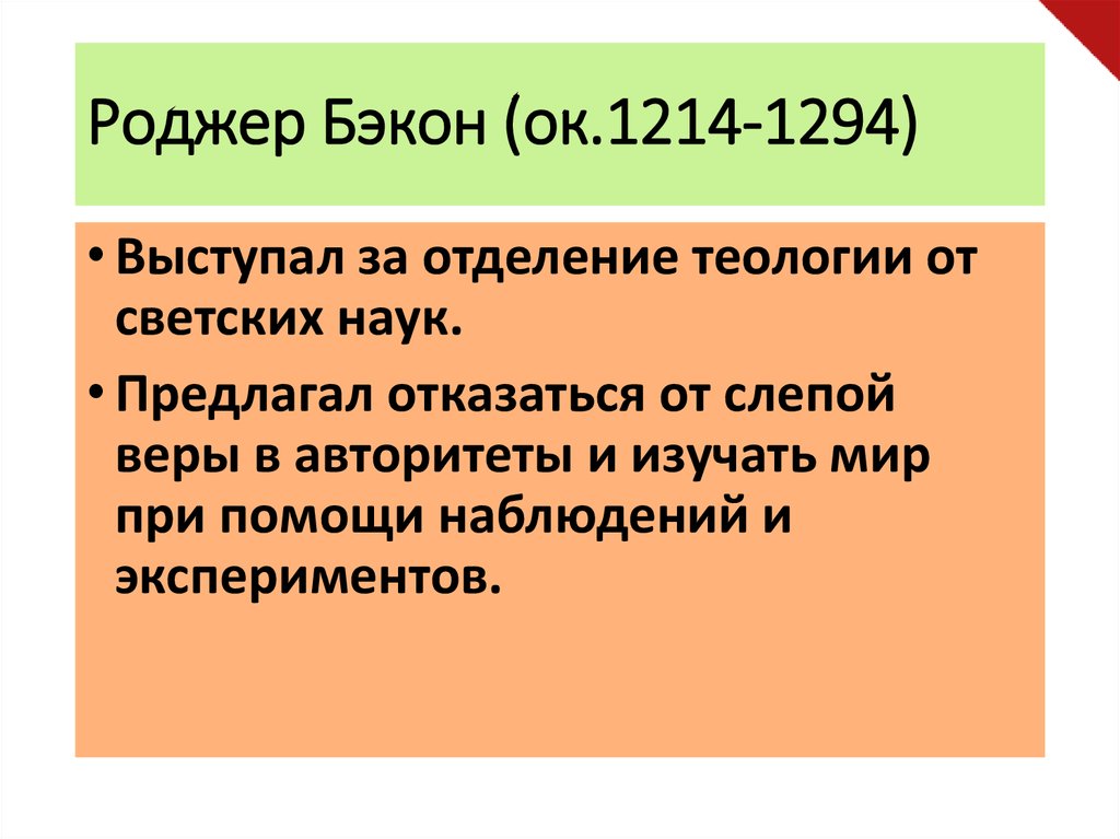 Роджер Бэкон (ок.1214-1294)• Выступал за отделение теологии от