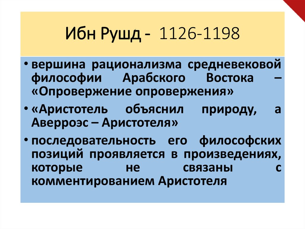 Ибн Рушд - 1126-1198• вершина рационализма средневековой