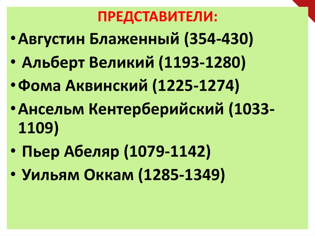 ПРЕДСТАВИТЕЛИ:• Августин Блаженный (354-430)