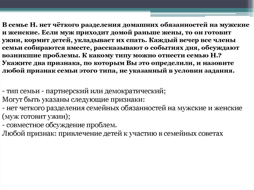 В семье Н. нет чёткого разделения домашних обязанностей на мужскиеи женские. Если муж приходит домой раньше жены, то он готовит