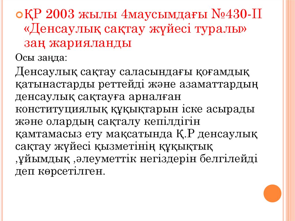 2003 жылы 4маусымдағы №430-II«Денсаулық сақтау жүйесі туралы»