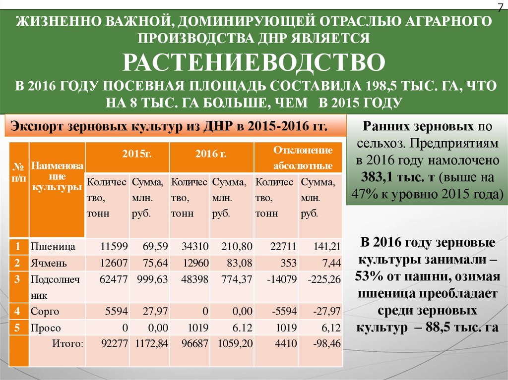 ЖИЗНЕННО ВАЖНОЙ, ДОМИНИРУЮЩЕЙ ОТРАСЛЬЮ АГРАРНОГОПРОИЗВОДСТВА ДНР ЯВЛЯЕТСЯ