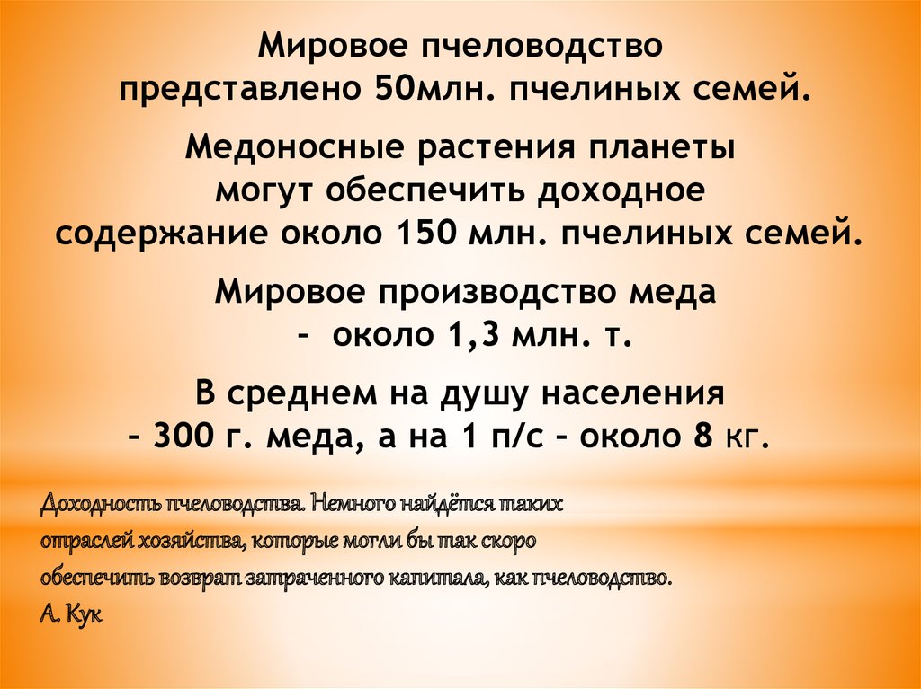 Мировое пчеловодствопредставлено 50млн. пчелиных семей.