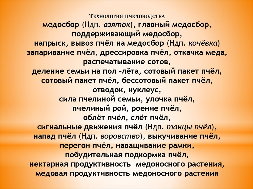 ТЕХНОЛОГИЯ ПЧЕЛОВОДСТВАмедосбор (Ндп. взяток), главный медосбор,