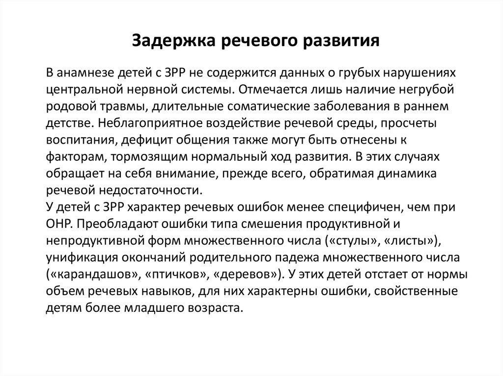 Задержка речевого развитияВ анамнезе детей с ЗРР не содержится данных о грубых нарушениях