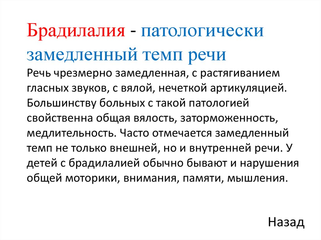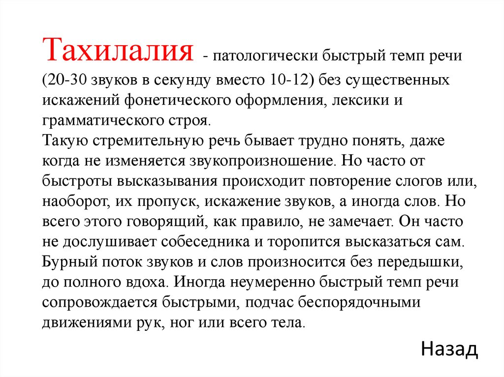 Тахилалия - патологически быстрый темп речи(20-30 звуков в секунду вместо 10-12) без существенных