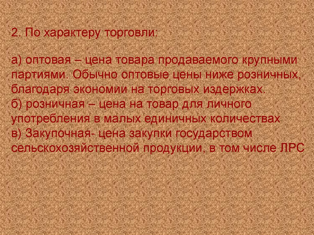 2. По характеру торговли:а) оптовая – цена товара продаваемого крупными