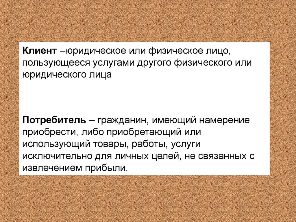 Клиент –юридическое или физическое лицо,пользующееся услугами другого физического или