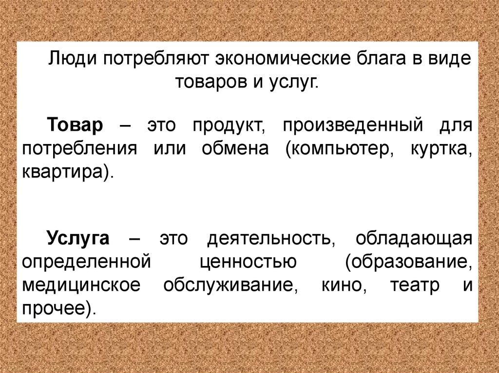 Люди потребляют экономические блага в видетоваров и услуг.