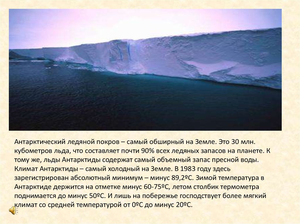 Антарктический ледяной покров – самый обширный на Земле. Это 30 млн.кубометров льда, что составляет почти 90% всех ледяных запасов на планете. К