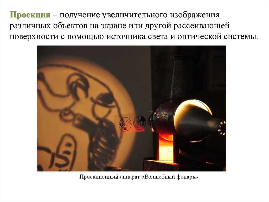 Проекция – получение увеличительного изображенияразличных объектов на экране или другой рассеивающей