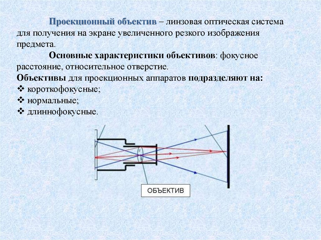 Проекционный объектив – линзовая оптическая системадля получения на экране увеличенного резкого изображения