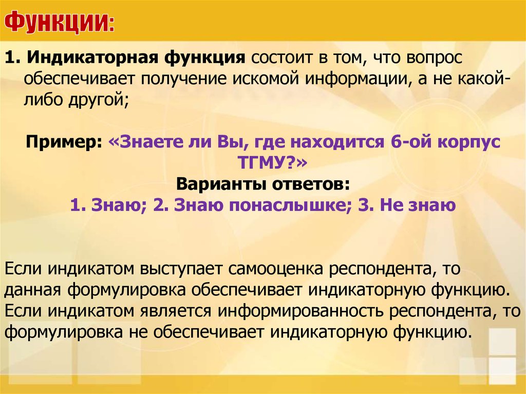 1. Индикаторная функция состоит в том, что вопрособеспечивает получение искомой информации, а не какойлибо другой;