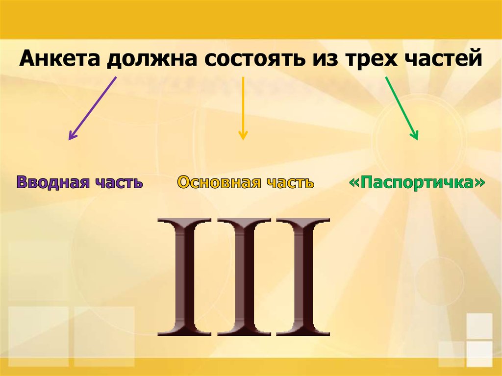 - На последнем месте в этой части анкетыставятся заключительные вопросы. Главная