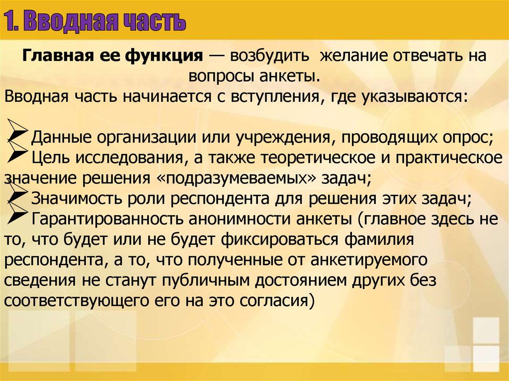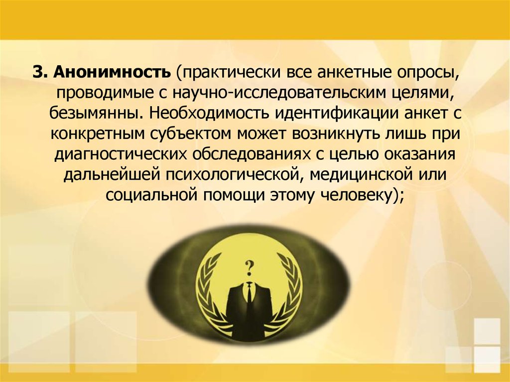 3. Анонимность (практически все анкетные опросы,проводимые с научно-исследовательским целями,
