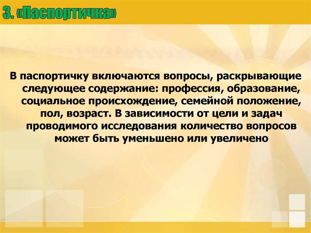 В паспортичку включаются вопросы, раскрывающиеследующее содержание: профессия, образование,