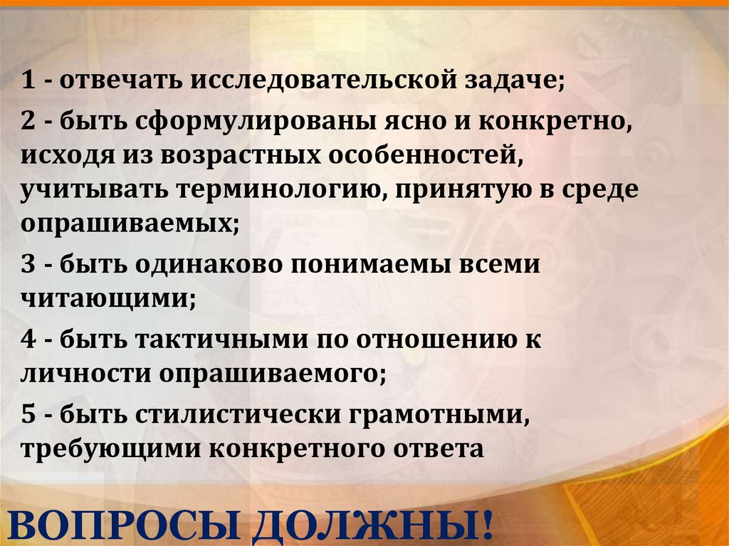 1 - отвечать исследовательской задаче;2 - быть сформулированы ясно и конкретно,