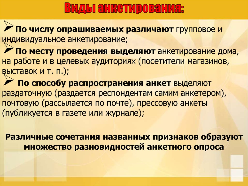 По числу опрашиваемых различают групповое ииндивидуальное анкетирование;