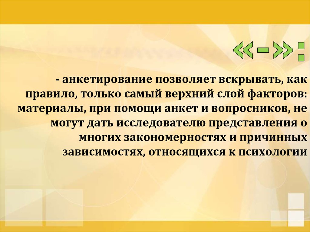- анкетирование позволяет вскрывать, какправило, только самый верхний слой факторов: