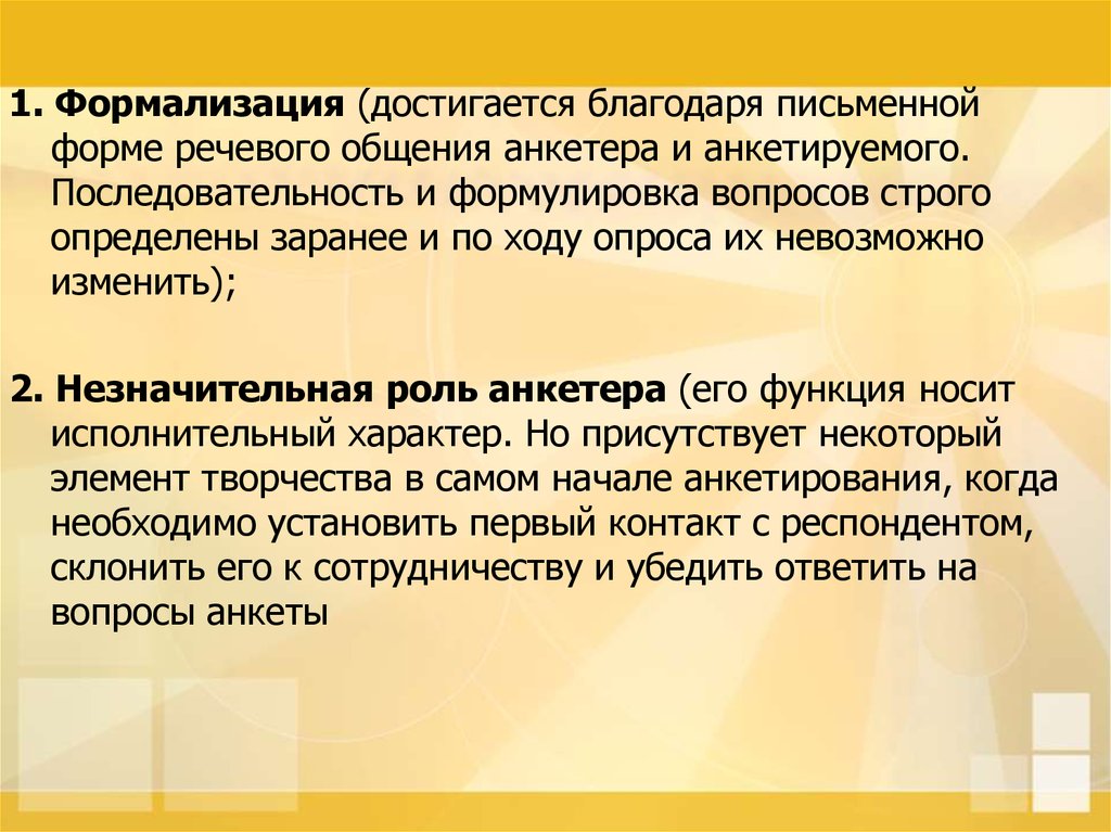1. Формализация (достигается благодаря письменнойформе речевого общения анкетера и анкетируемого.